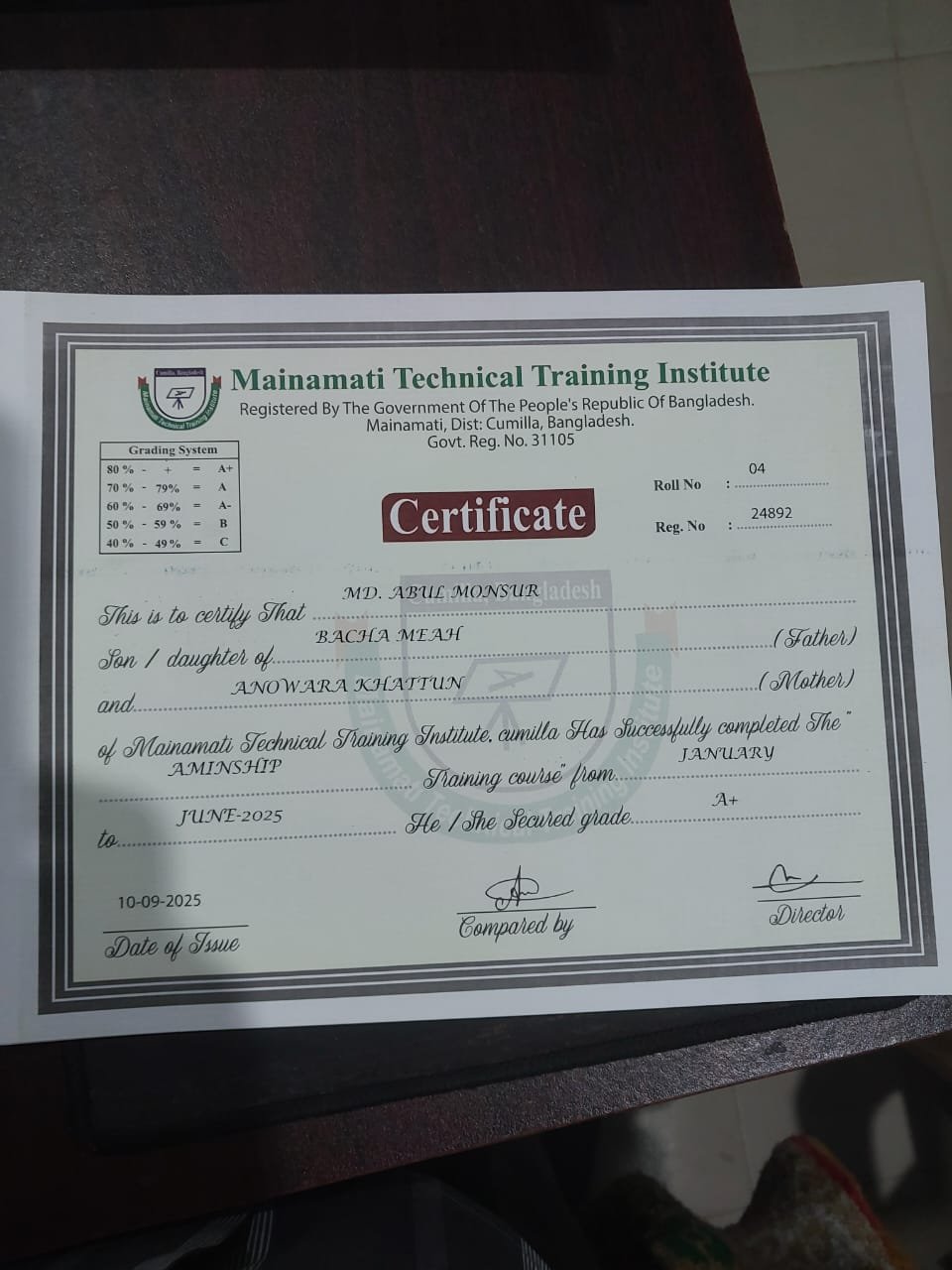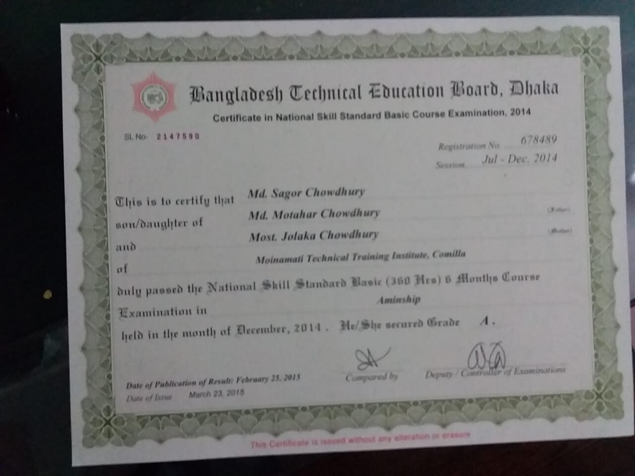 প্রতিষ্ঠান ১ –  বাংলাদেশ কারিগরি শিক্ষা বোর্ড অনুমোদিত কোড – ৬৫১৩৬ কুমিল্লা ।